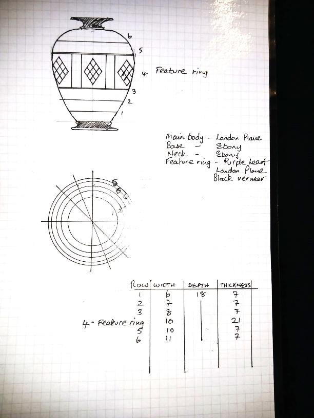 The main body had been glued to a piece of Ebony at the head stock end, a hole had already been drilled in the top of the vase to take a scrap of wood with a spigot on so that the tailstock could be brought up. The piece was now ready to start turning photo 2.