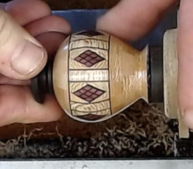 Placing the vase back on to the lathe the top was fitted to the vase by enlarging the aperture until it was a firm fit, then glued it in place before continuing to shape the top. Photo 6
