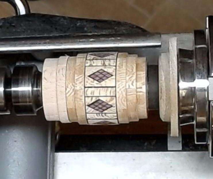 Andy then went on to describe how he had made a sledge for his circular saw to enable him to cut the segmented pieces accurately before gluing them together. Before returning to the piece on the lathe.