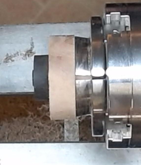 The next operation was to make the top piece which was to fit onto the vase, so he removed the piece from the lathe and picking up a waste piece of wood which had already been turned with a spigot and a piece of Ebony glued onto it, placed into the chuck. Photo 4